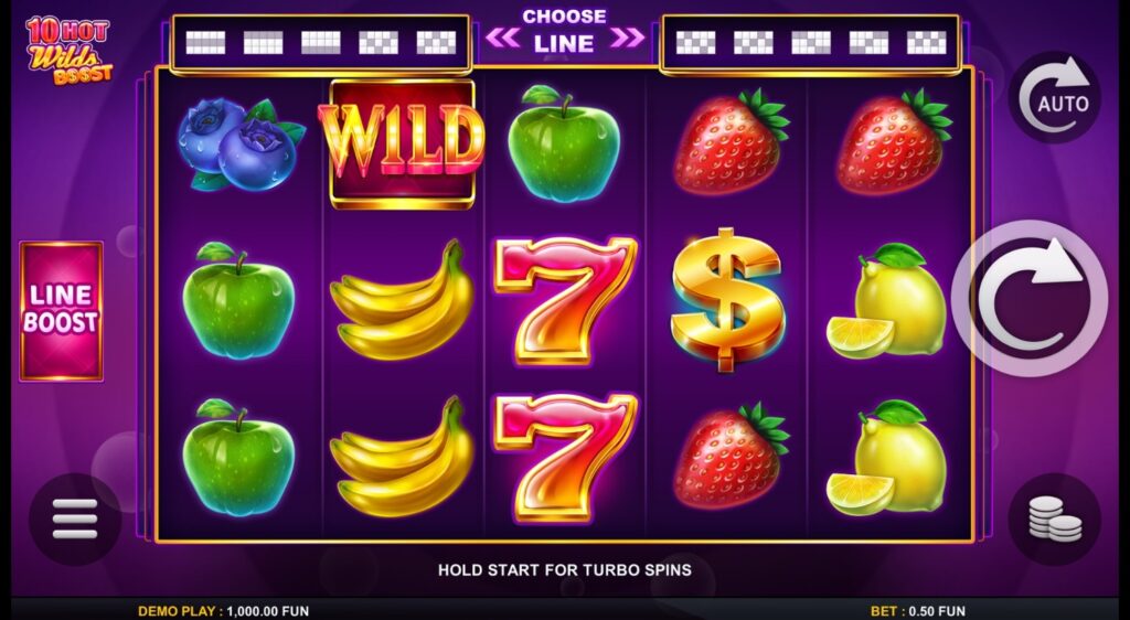 Brukergrensesnittet i 10 Hot Wilds Boost er moderne og brukervennlig. Alle viktige kontroller er logisk plassert og lett tilgjengelige. Spinnknappen er sentrert og fremtredende, mens innsats- og innstillingskontroller er plassert på en intuitiv måte. Spillinformasjon, inkludert gevinsttabell og regler, er tilgjengelig via en dedikert informasjonsknapp. Autospinnfunksjonen lar deg forhåndsinnstille antall spinn og sette grenser for tap og gevinst, noe som gir god kontroll over spilløkten.