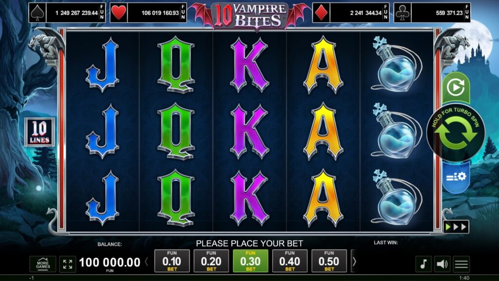 Brukergrensesnittet i 10 Vampire Bites er moderne og brukervennlig. Alle viktige kontroller er logisk plassert og lett tilgjengelige. Spinnknappen er sentrert og fremtredende, mens innsats- og innstillingskontroller er plassert på en intuitiv måte. Spillinformasjon, inkludert gevinsttabell og regler, er tilgjengelig via en dedikert informasjonsknapp. Autospinnfunksjonen lar deg forhåndsinnstille antall spinn og sette grenser for tap og gevinst, noe som gir god kontroll over spilløkten.