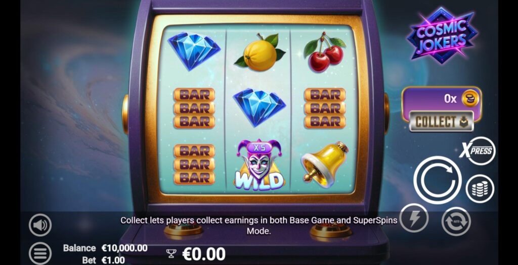 Brukergrensesnittet i Cosmic Jokers er moderne og brukervennlig. Alle viktige kontroller er logisk plassert og lett tilgjengelige. Spinnknappen er sentrert og fremtredende, mens innsats- og innstillingskontroller er plassert på en intuitiv måte. Spillinformasjon, inkludert gevinsttabell og regler, er tilgjengelig via en dedikert informasjonsknapp. Autospinnfunksjonen lar deg forhåndsinnstille antall spinn og sette grenser for tap og gevinst, noe som gir god kontroll over spilløkten.