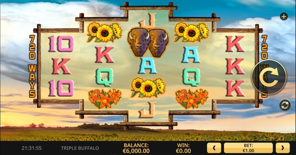 Brukergrensesnittet i Triple Buffalo er moderne og brukervennlig. Alle viktige kontroller er logisk plassert og lett tilgjengelige. Spinnknappen er sentrert og fremtredende, mens innsats- og innstillingskontroller er plassert på en intuitiv måte. Spillinformasjon, inkludert gevinsttabell og regler, er tilgjengelig via en dedikert informasjonsknapp. Autospinnfunksjonen lar deg forhåndsinnstille antall spinn og sette grenser for tap og gevinst, noe som gir god kontroll over spilløkten.
